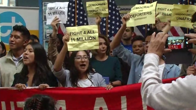 SAN FRANCISCO (KGO) -- Several dozen young immigrants shouted down Nancy Pelosi, the top Democrat in the U.S. House, on Monday during an event in San Francisco, following her recent conversations with President Donald Trump over the future of a program that grants many of them legal status.