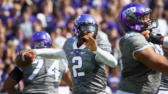 On the ensuing free kick, Nick Rose's kickoff went out of bounds, giving the Horned Frogs the ball at the 50. Five plays later, TCU went up 16-0 on a 15-yard pass to Doctson, who had seven catches for 129 yards. His 23 career touchdowns are one more than Josh Boyce had from 2010 to 2012.