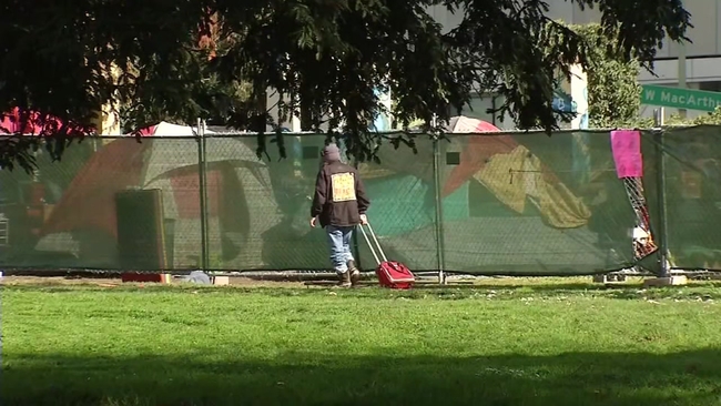 OAKLAND, Calif. (KGO) -- Chanting "housing is a human right," activists and homeless individuals set up tents at Frank Ogawa Plaza.